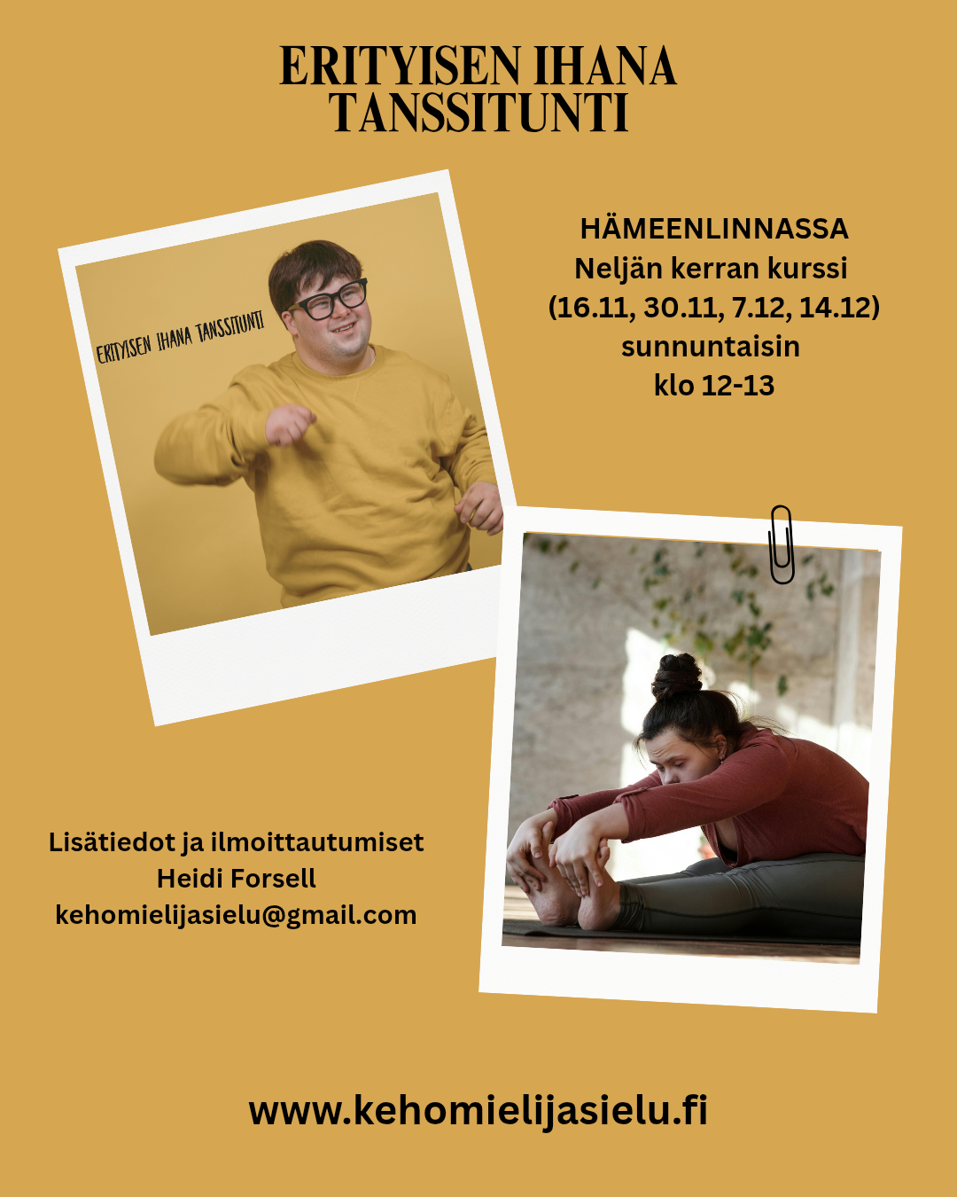 Erityisen ihana tanssitunti on tanssitunti kehitysvammaisille/ erityistä tukea tarvitseville nuorille ja aikuisille. Tunnilla tanssitaan helppoja koreografioita musiikista ja liikkumisesta nautiskellen. Tunnilla hyödynnetään myös tanssi-liiketerapeuttisia menetelmiä. Tanssitunnit eivät vaadi aikaisempaa kokemusta tanssimisesta. Tärkeintä tällä tunnilla on hyvä fiilis, tanssimisen ilo ja oman kehon liikkeestä nauttiminen