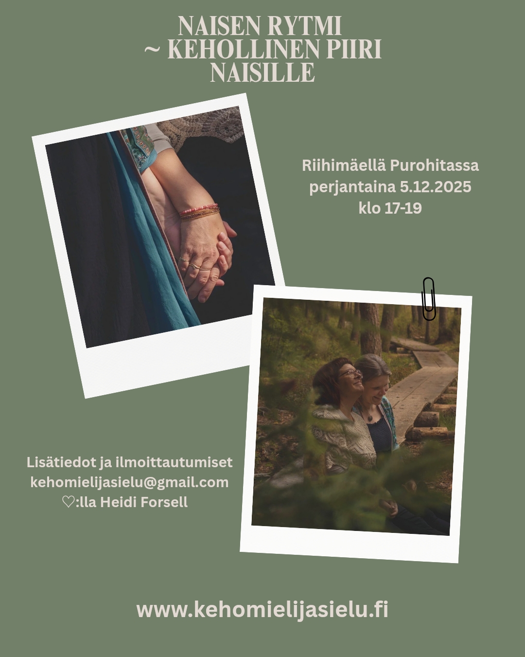 Naisen rytmi on piiri naisille, jotka kaipaavat yhteyttä kehoonsa, luontoonsa ja toisiin naisiin. Naisen rytmi on lempeä ja turvallinen tila pysähtyä, hengittää ja kuulostella omaa kehoa ja kaikkea sitä, mikä itsessä ja omassa elämässä liikkuu. Naisen rytmi on luovuutta, liikettä ja pysähtymistä, voimaa ja pehmeyttä, kuulemista ja näkemistä, jakamista ja vastaanottamista. Naisen rytmi on omien rajojen oppimista, kuulemista ja kunnioittamista.Naisen rytmi on lempeä hetki itsellesi yhdessä muiden kanssa. Tule sellaisena kuin tässä hetkessä olet. Keho tietää ja tuntee tien. Sinun ei tarvitse osata mitään. Rittää että olet nainen, joka haluaa palata omaan rytmiinsä. Talvi ja lähestyvä joulun aika on täydellinen hetki palata rytmiin joka juuri nyt luontaisesti vaan hidastuu ja hidastuu.