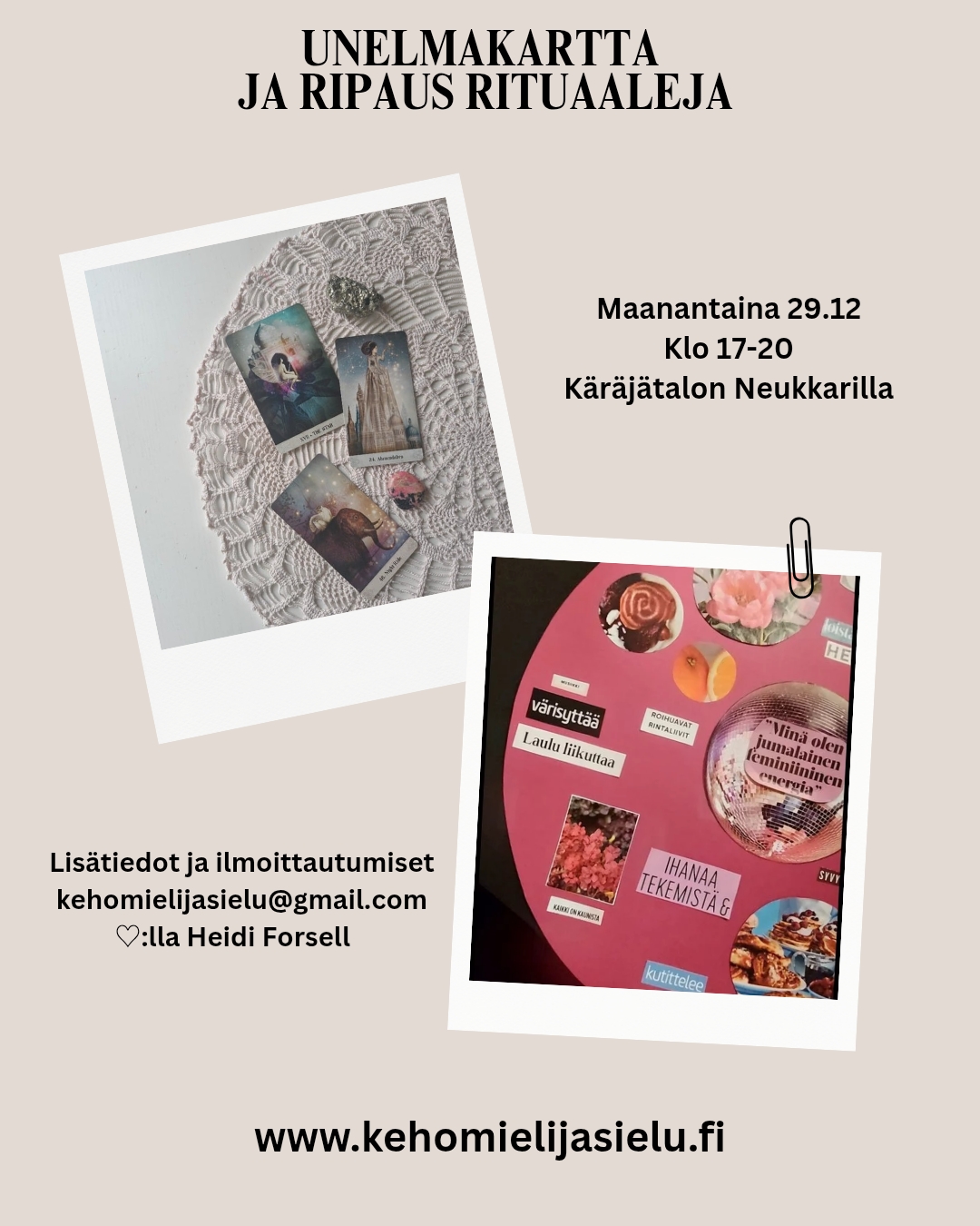 Aloitetaan työpaja yhteisellä kehoon laskeutumisella, jonka jälkeen on ihana lähteä luomaan omaa unelmakarttaa. Sinne saatta tulla piirryneeksi asioita, joita ei tässä hetkessä osaa vielä omiksi unelmiksi edes kuvitella. Kurkataan myös sun ensi vuoden Tarot kortti ja mitä ensi vuosi ehkä kollektiivisesti tuo tullessaan.