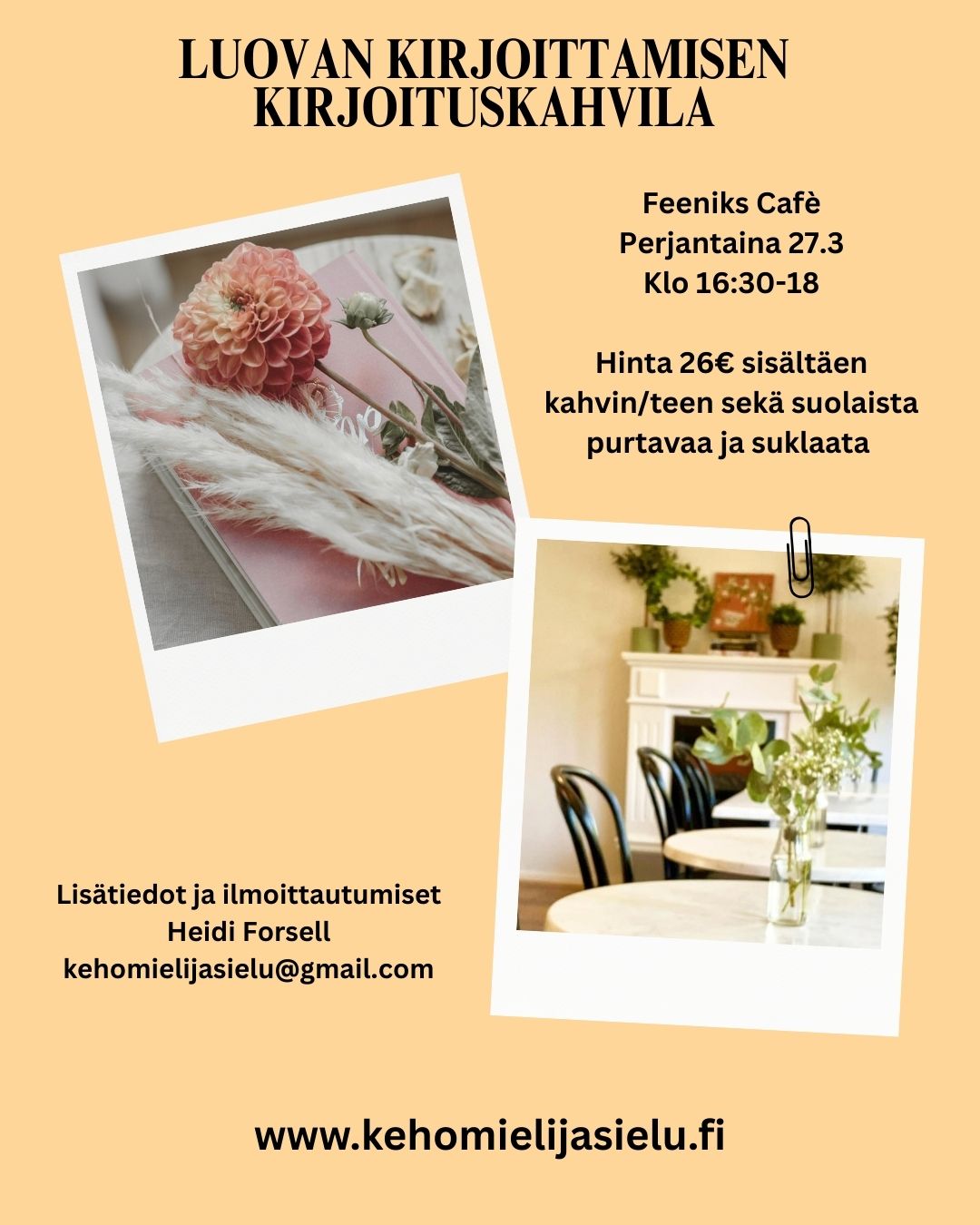 Kirjoituskahvilan osallistuminen kustantaa 26€ sisältäen ohjauksen sekä kahvin/teen, ciabattaa ja suklaata. Heidi vastaa ohjauksesta ja Feeniks Cafèn Tiina kahvilan herkuista.